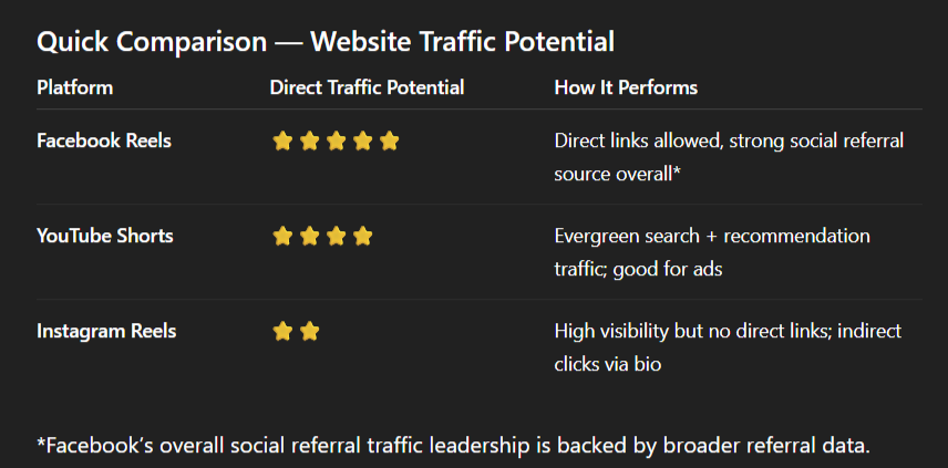 Let’s take a clear look at the three biggest players — Facebook Reels, Instagram Reels, and YouTube Shorts — and break down which ones are actually effective at driving traffic to your website.